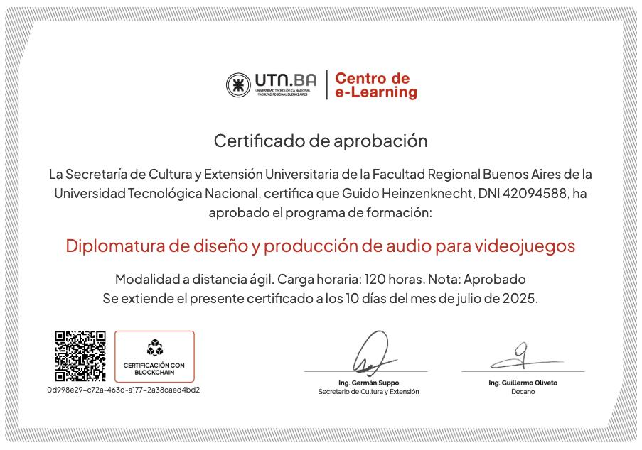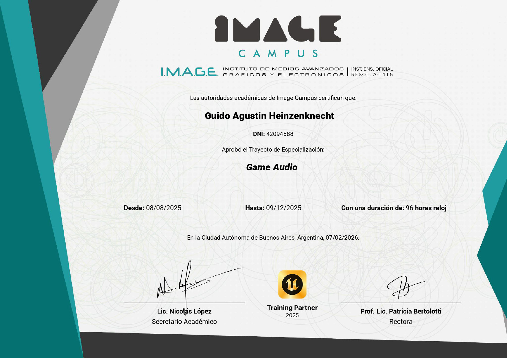 Complete certification in sound design and implementation issued by Image Campus, Argentina's most prestigious video game education institution.